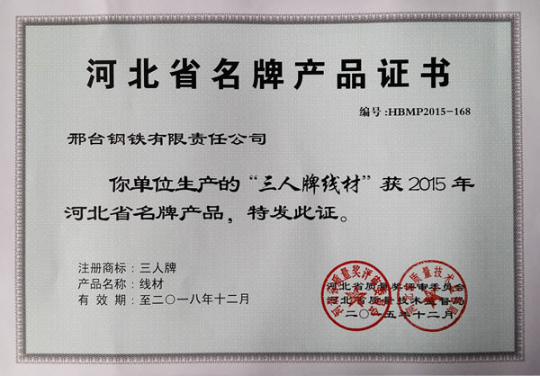 The "Three Persons brand" wire product was awarded Hebei Province Famous Brand Product on 2015.