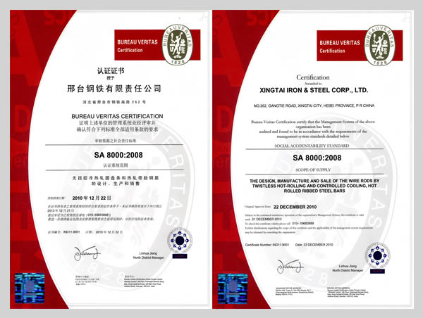 Xingtai Steel is the first metallurgical enterprise passed Certification of Social Accountability 8000 System.