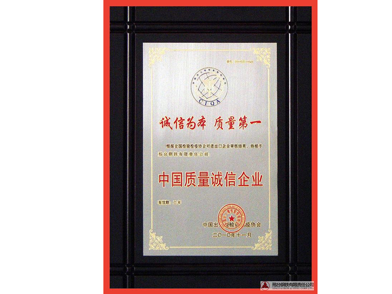 Xingtai Steel was awarded the Quality Credit Enterprise by CHINA ENTRY-EXIT INSPECTION AND QUARANTINE ASSOCIATION.