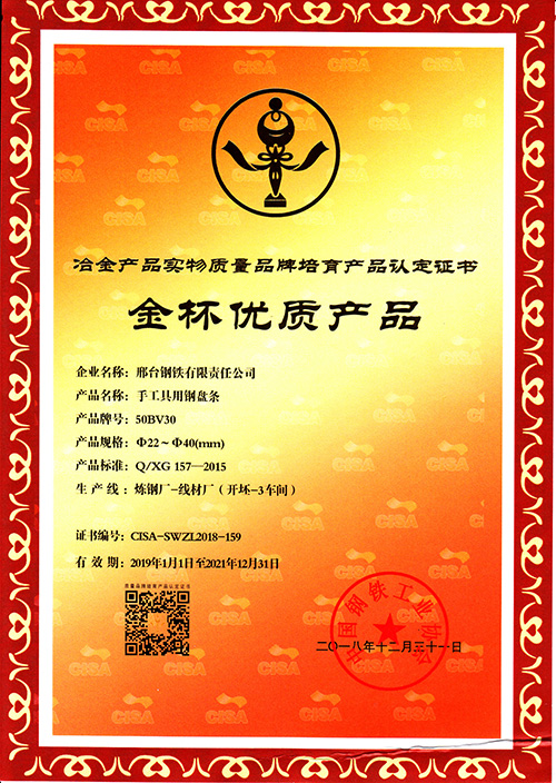 手工具用鋼盤條50BV30φ22-40mm規(guī)格,獲冶金產(chǎn)品實物質(zhì)量金杯優(yōu)質(zhì)產(chǎn)品認(rèn)定證書。