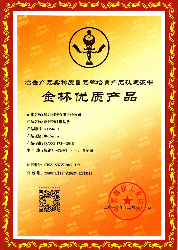 邢鋼銅包鋼絲用盤條XGM6-1 φ6.5mm規(guī)格獲冶金產(chǎn)品實物質(zhì)量金杯優(yōu)質(zhì)產(chǎn)品認(rèn)定證書