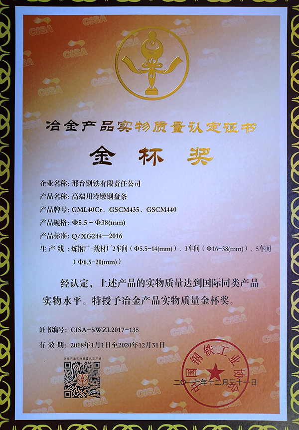 高端用冷鐓鋼盤條GML40Cr、GSCM435、GSCM440Φ5.5~Φ38(mm)獲冶金產(chǎn)品實(shí)物質(zhì)量金杯獎