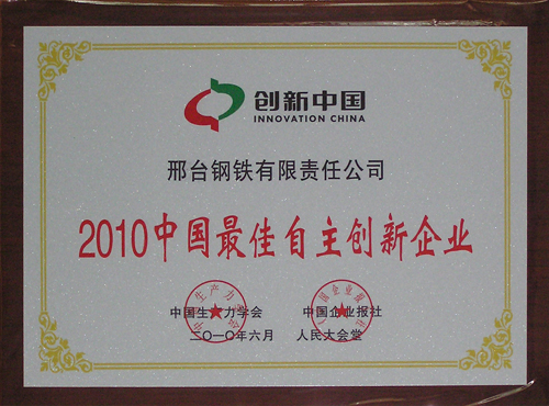 2010年6月,邢鋼榮獲“2010中國最佳自主創(chuàng)新企業(yè)”稱號(hào)