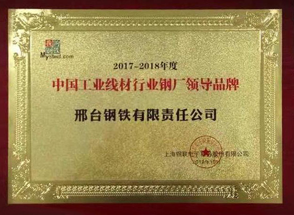 2018年10月22日,在上海舉辦的“2018年Mysteel中國工業(yè)線材暨緊固件產(chǎn)業(yè)鏈高峰論壇”上,論壇評(píng)委會(huì)根據(jù)對(duì)國內(nèi)工業(yè)線材生產(chǎn)鋼廠2017-2018年品牌、質(zhì)量和市場反饋等評(píng)比,評(píng)選出“中國工業(yè)線材行業(yè)鋼廠領(lǐng)導(dǎo)品牌”,邢鋼獲此殊榮。