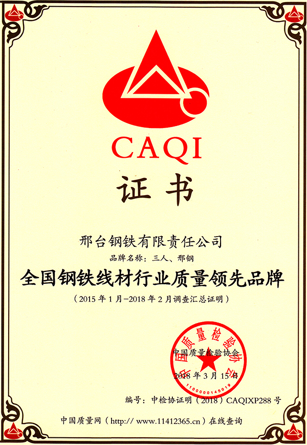 2018年3月15日,邢鋼“三人、邢鋼”品牌獲得“全國鋼鐵線材行業(yè)質(zhì)量領(lǐng)先品牌”稱號(hào)。