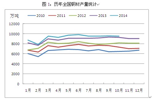 其一,鋼材產(chǎn)量增速有所回落。根據(jù)統(tǒng)計(jì),2014年1-10月,我國粗鋼產(chǎn)量68535萬噸,同比增長2.1%,增速同比減緩7.1個百分點(diǎn);鋼材產(chǎn)量93447萬噸,增長4.7%,減緩6.9個百分點(diǎn),國家政策的導(dǎo)向在這其中起了主要作用。一方面,2014年我國從政策上嚴(yán)格限制了鋼鐵等產(chǎn)能過剩行業(yè)的投資,由此導(dǎo)致除新疆地區(qū)外,其余省份全年均無高爐新建計(jì)劃,鋼鐵新增產(chǎn)能被控制;另一方面,京津冀地區(qū)持續(xù)霧霾天氣引發(fā)了公眾普遍擔(dān)憂,作為全國鋼鐵生產(chǎn)基地的河北省不時由于環(huán)境污染而被強(qiáng)制采取限產(chǎn)措施,雖然對于環(huán)保排污設(shè)施較為齊全的大型鋼廠影響有限,但中小型鋼廠的生產(chǎn)卻受到了較為明顯的影響,全國鋼材整體產(chǎn)量增速下滑也就變得順理成章