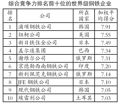自世界鋼動(dòng)態(tài)公司2002年開始發(fā)布競(jìng)爭(zhēng)力排名,浦項(xiàng)鋼鐵公司此后連續(xù)三年位居第一,雖然在2005年至2009年期間其榜首位置先后被印度塔塔鋼鐵公司和俄羅斯謝維爾公司搶占,但浦項(xiàng)在此期間一直保持在第二的位置,并且于2010年重新登上榜首位置,并一直蟬聯(lián)至今,可以說是全球最具競(jìng)爭(zhēng)力的鋼鐵企業(yè)實(shí)至名歸。