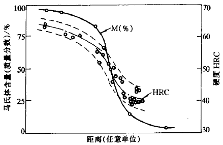 應當指出,采用由表面到半馬氏體組織的距離作為淬透性的判定標準僅在于測量上的方便,就鋼淬火后力學性能方面,淬硬層中含部分非馬氏體組織將導致性能降低,尤其是某些受力較大結構件一般要求淬透層馬氏體量達到90%以上。因此可根據(jù)不同性能要求選取表面到不同含量馬氏體組織的距離為淬透層深度。