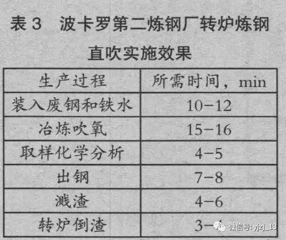 該廠在實(shí)施直吹后,轉(zhuǎn)爐冶煉所需要的全部氧量一次吹入熔池。首次吹煉之后的倒渣、取樣和測(cè)溫全部省掉。采用計(jì)算機(jī)靜態(tài)控制,極大地提高了終點(diǎn)溫度和成分的命中率。實(shí)施直吹工藝后,冶煉周期各工序時(shí)間如表 3 所示。轉(zhuǎn)爐車間生產(chǎn)率提高了 25%。