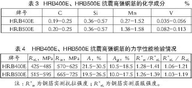 我國在GB 1499.2-2007標準中首次將鋼筋的抗震性能指標納入國標中,并規(guī)定了抗震鋼筋的三個代表性指標:強屈比(R?m /R?eL)、超屈比(R?eL/ReL)和最大力總伸長率(Agt)。國內(nèi)某鋼廠HRB400E、HRB500E抗震鋼筋多樣品檢驗獲得的化學成分和力學性能指標見表3和表4。