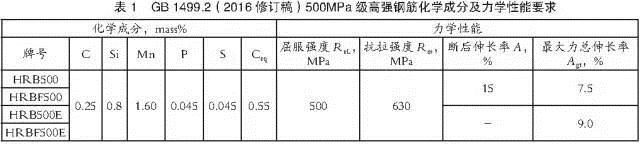 GB l499.2(2016修訂稿)規(guī)定HRB500的化學成分和碳當量應(yīng)符合表1的要求,并根據(jù)需要鋼中還可以加入釩、鈮、鈦等元素。