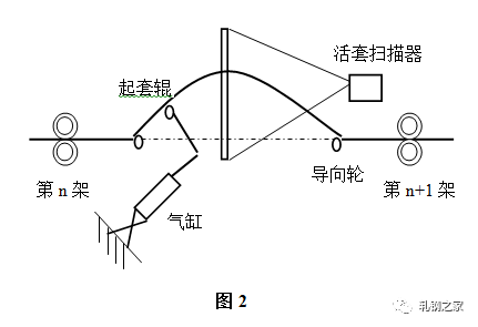 活套是用來(lái)檢測(cè)和調(diào)節(jié)相鄰機(jī)架間速度關(guān)系從而實(shí)現(xiàn)無(wú)張力軋制的設(shè)備?;钐字饕苫钐讙呙杵?、起套輥及其調(diào)節(jié)器等組成,結(jié)構(gòu)如(圖2)所示。主要作用是根據(jù)檢測(cè)的套位信號(hào)來(lái)控制上游軋機(jī)的速度,實(shí)現(xiàn)自動(dòng)控制系統(tǒng)。