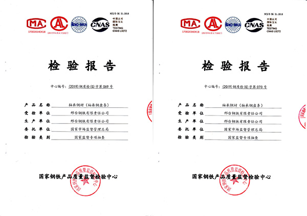 受?chē)?guó)家市場(chǎng)監(jiān)督管理總局委托,2019年11月國(guó)家鋼鐵產(chǎn)品質(zhì)量監(jiān)督檢驗(yàn)中心對(duì)邢鋼高碳鉻軸承鋼進(jìn)行了監(jiān)督抽查,判定依據(jù)為《2019年軸承鋼材產(chǎn)品質(zhì)量國(guó)家監(jiān)督專(zhuān)項(xiàng)抽查方案》,現(xiàn)場(chǎng)抽取了2個(gè)批次盤(pán)條,近日公司收到檢測(cè)報(bào)告2個(gè),結(jié)論為:所檢項(xiàng)目符合GB/T18254-2016《高碳鉻軸承鋼》標(biāo)準(zhǔn)及抽樣方案,判定合格,報(bào)告中顯示,7大項(xiàng)29個(gè)項(xiàng)目結(jié)果全部高于該產(chǎn)品標(biāo)準(zhǔn),達(dá)到了高級(jí)優(yōu)質(zhì)鋼級(jí)別水平。