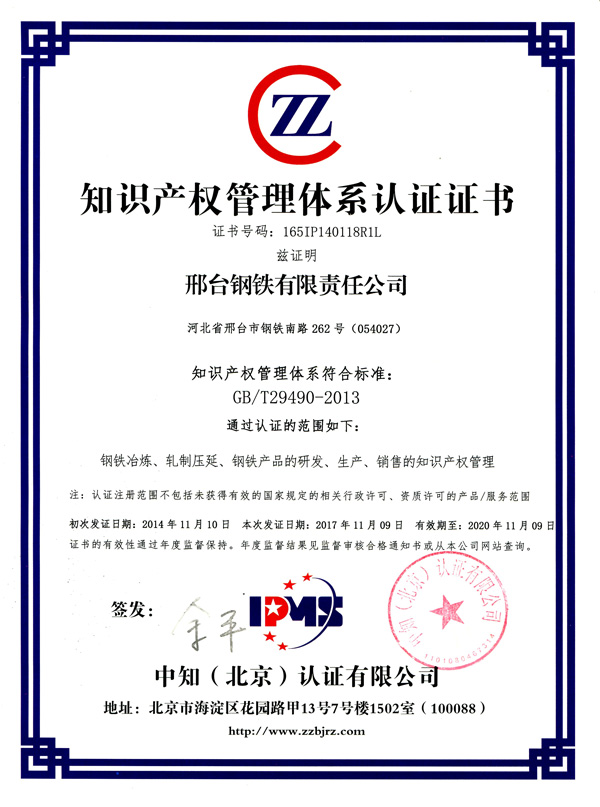 Xingtai Steel, as the only enterprise in Xingtai City, was selected into the pilot enterprises of the IP management standard in June 2012. In December 2013, Xingtai Steel was identified by the State Intellectual Property Office as one of the first batch of state-level IP competitive enterprises. In November 2014, Xingtai Steel passed the IP management system certification by Zhongzhi (Beijing) Certification Co., Ltd for the first time. Until now, our company got nearly 300 patents, as well as 73 provincial scientific and technological achievements. In August 2020, Xingtai Steel ranked 34th in the technical competitiveness ranking of world's iron&Steel enterprises and ranked 27th in patent technical ability of world’s steel enterprises.