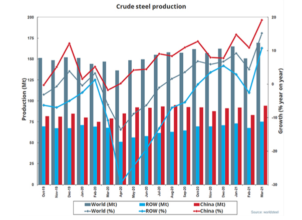世界鋼協(xié):2021年3月全球粗鋼產(chǎn)量1.692億噸