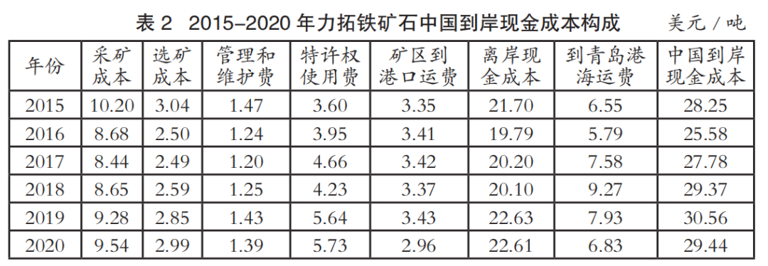 中國進(jìn)口鐵礦石到岸成本主要由離岸現(xiàn)金成本和海運(yùn)成本兩部分構(gòu)成。表1至表4為2015-2020年國際四大礦鐵礦石中國到岸現(xiàn)金成本構(gòu)成情況(數(shù)據(jù)來源:AME),其中離岸現(xiàn)金成本由采礦成本、選礦成本、管理和維護(hù)費(fèi)、特許權(quán)使用費(fèi)和礦區(qū)到港口運(yùn)費(fèi)構(gòu)成;中國到岸現(xiàn)金成本由離岸現(xiàn)金成本和到青島港海運(yùn)費(fèi)構(gòu)成;該成本數(shù)據(jù)僅為現(xiàn)金成本,不含國際四大礦的融資、折舊費(fèi)用。