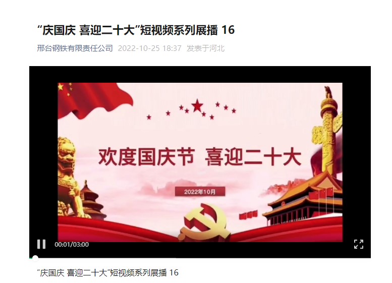 二十大期間,邢鋼組織開展了“慶國慶,喜迎二十大”邢鋼快閃短視頻、邢鋼故事短視頻作品征集活動,展示了公司良好的企業(yè)形象和員工的精神風貌。目前,短視頻作品正在通過邢鋼“企業(yè)微信”、微信公眾號平臺和公司內(nèi)網(wǎng)“視頻新聞”欄目陸續(xù)展播中。