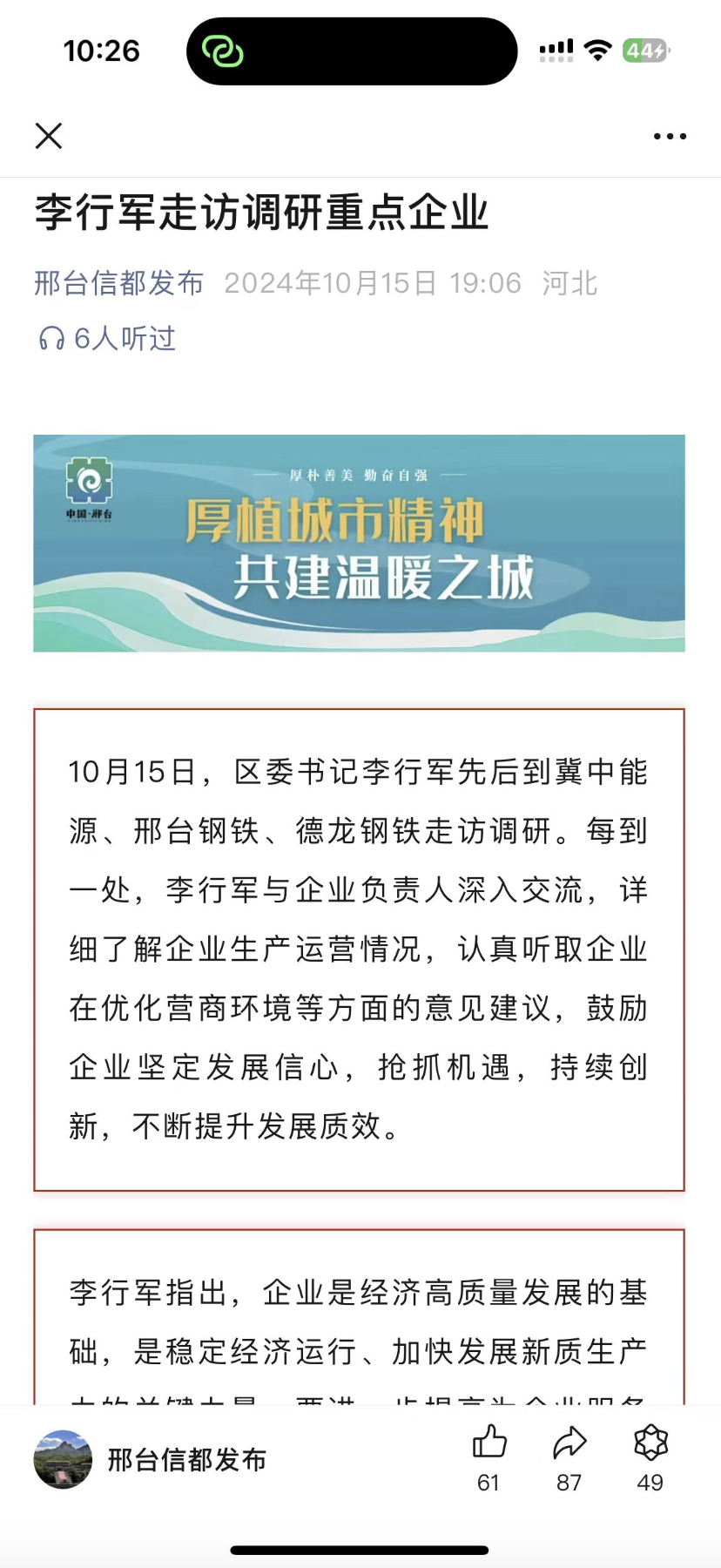 10月15日,區(qū)委書記李行軍先后到冀中能源、邢臺鋼鐵、德龍鋼鐵走訪調(diào)研。每到一處,李行軍與企業(yè)負(fù)責(zé)人深入交流,詳細(xì)了解企業(yè)生產(chǎn)運營情況,認(rèn)真聽取企業(yè)在優(yōu)化營商環(huán)境等方面的意見建議,鼓勵企業(yè)堅定發(fā)展信心,搶抓機遇,持續(xù)創(chuàng)新,不斷提升發(fā)展質(zhì)效。