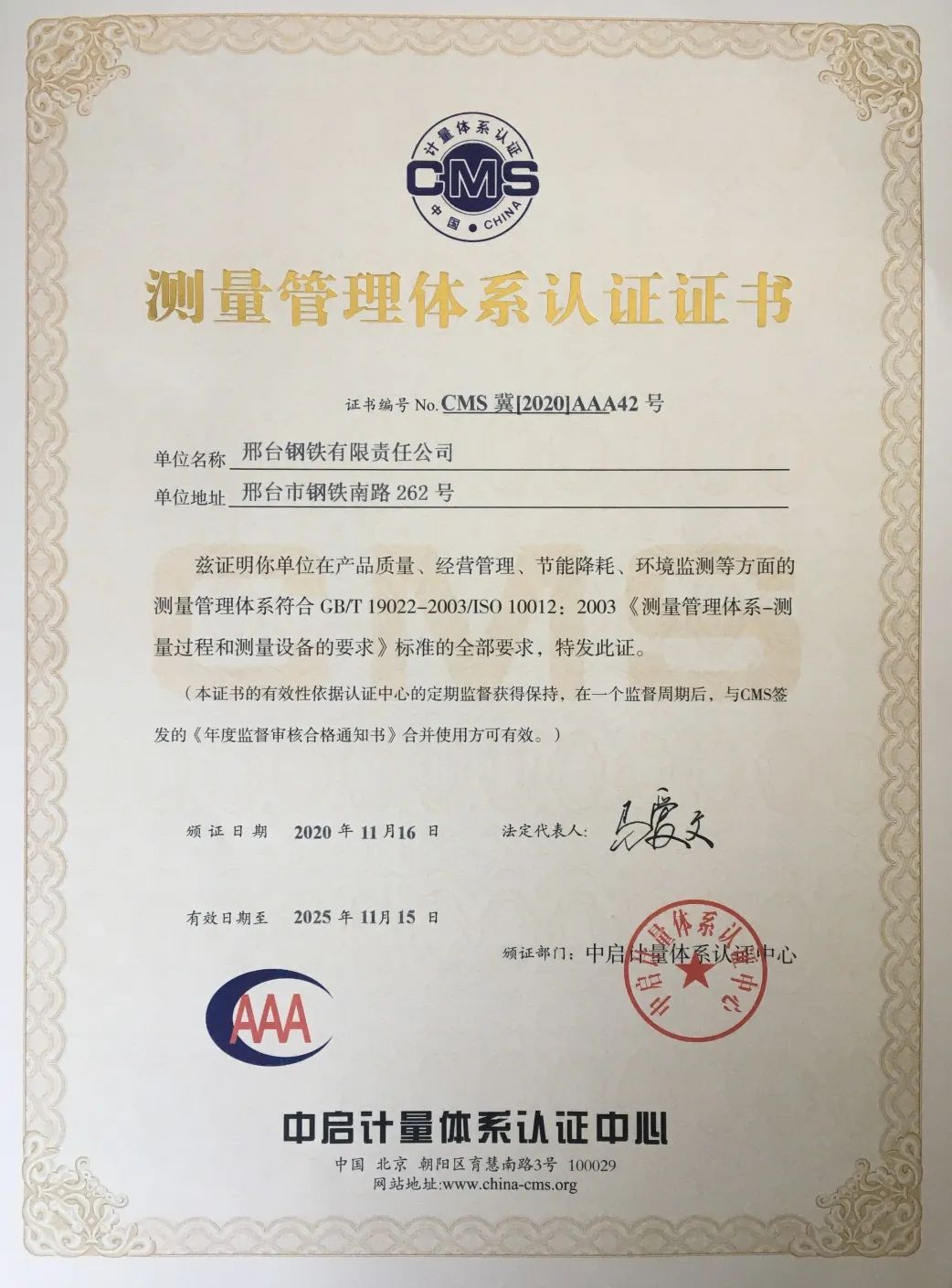 近日,邢鋼正式獲得由中啟認(rèn)證中心頒發(fā)的AAA級(jí)«測(cè)量管理體系年度監(jiān)督審核合格通知書»,該證書是測(cè)量管理體系認(rèn)證的最高等級(jí)證書,證書的持續(xù)取得,標(biāo)志著我公司測(cè)量管理水平已達(dá)到國(guó)家和國(guó)際標(biāo)準(zhǔn)要求。