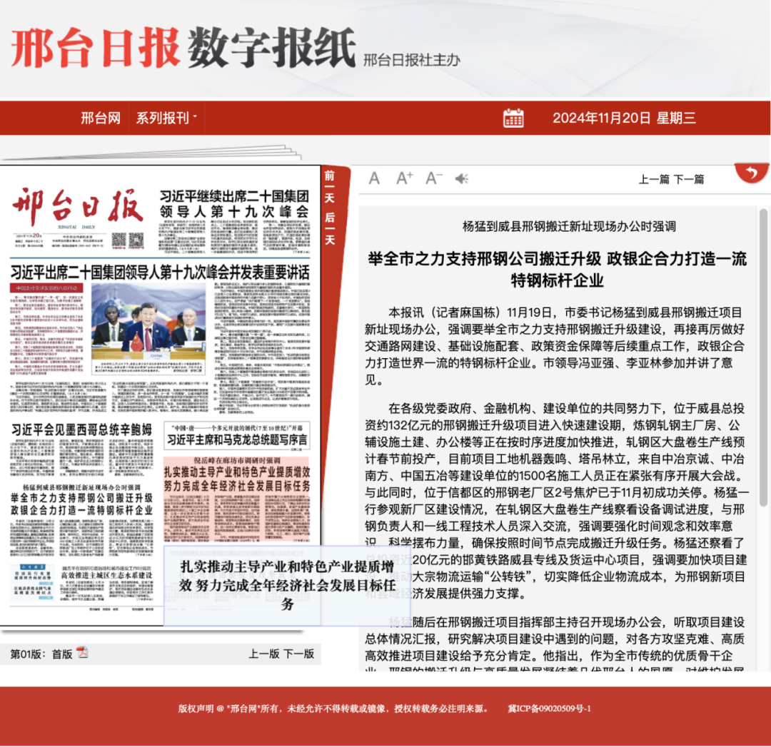 《邢臺日報》11.20頭版報道
