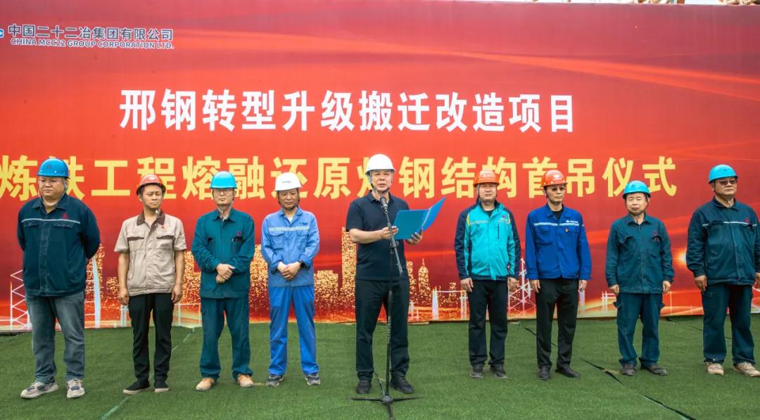 On July 8, the ironmaking zone of Xingtai Steel's relocation and transformation project witnessed a historic moment as the 46-ton steel baseplate of the smelting reduction furnace was successfully installed. The ceremony, attended by Chairman Zhang Yuming, General Manager Peng Shidan, Vice Presidents Ma Baoliang, Liu Wanchao, and Han Qinglian, along with project leaders, marked the official commencement of the furnace installation phase - a significant step in the company's green transformation strategy.