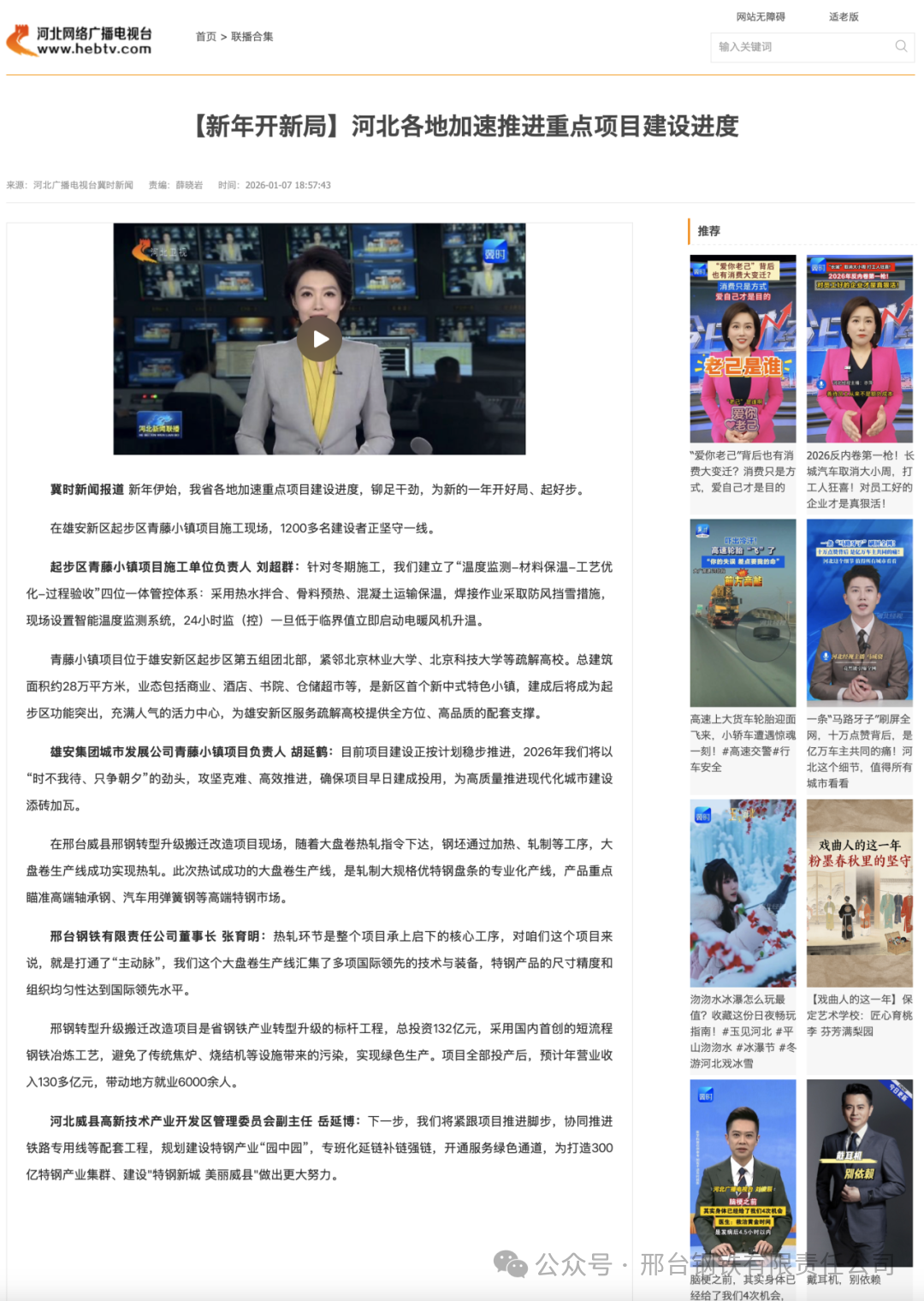 邢鋼轉型升級搬遷改造項目是省鋼鐵產業(yè)轉型升級的標桿工程,總投資132億元,采用國內首創(chuàng)的短流程鋼鐵冶煉工藝,避免了傳統焦爐、燒結機等設施帶來的污染,實現綠色生產。項目全部投產后,預計年營業(yè)收入130多億元,帶動地方就業(yè)6000余人。